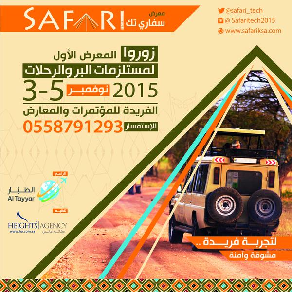 تستضيف الرياض الاسيوع المقبل فعاليات معرض سفاري تك الدولي، وذلك لأول مرة في المملكة العربية السعودية خلال الفترة من 3-5 نوفمبر 2015 لمدة 3 ايام في قاعة الفريدة، برعاية مجموعة الطيار للسفر والسياحة حيث يهدف المعرض لتسليط الضوء على مستجدات سوق الرحلات البرية والسياحية والبحرية والتعريف بمنظمي الرحلات المتخصصين والمتواجدين في الخدمة في كافة مدن المملكة وفي خارج السعودية لرحلات الدولية.