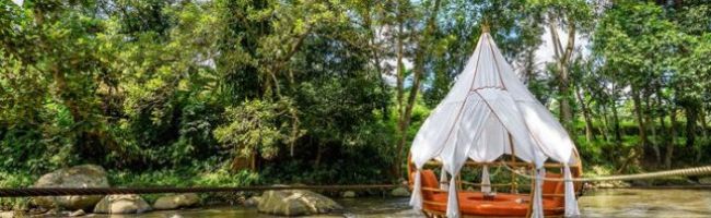 من المنتجعات الصحية الجميلة بجانب نهر أيونغ Ayung River، يمكنك الاستمتاع بتجربة السرير فوق مياه النهر والاستمتاع في الجلوس في المباني المصنوعة من الخيزارن بجانب النهر تم إنشاءه من قبل المهندس العالمي Mrs. Elora Hardy، يقدم كافة الخدمات التي تشعر الزائر بالراحة و الهدوء والاستجمام يوجد به مطعم يقدم الآكلات والمشروبات البالية تستطيع قضاء اليوم بالكامل داخل المنتجع مع الأهل والأصدقاء (متاح بالحجز المسبق)