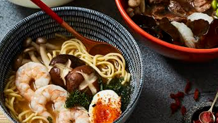 ’ميزو تسوكيمن‘: نودلز البيض، مرق الميزو، روبيان، بيض مسلوق، فطر الإينوكي، فطر شيتاكي. 60 درهم إماراتي.