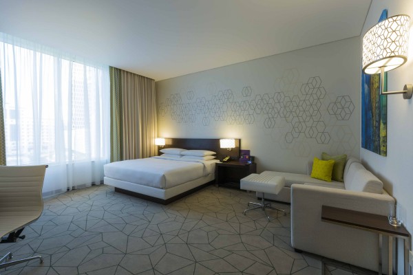 - 126 غرفة فندقية فسيحة، تشمل كل واحدة منها سرير «حياة جراند» المترف، وركناً مريحاً مع أريكة-سرير، ومساحة معيشة منفصلة ومساحة عمل
