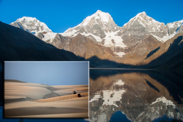 البيرو هي بلد الصحاري الشاسعة مثل باراكاس والجبال الثلجية مثل هواسكاران أو Yerupajá، وهي أعلى قمتين في البلاد، ويمكن الاستمتاع بالجو البارد و الحار والمناخ المثالي في البيرو في مجموعة كبيرة من المناظر الطبيعية المختلفة