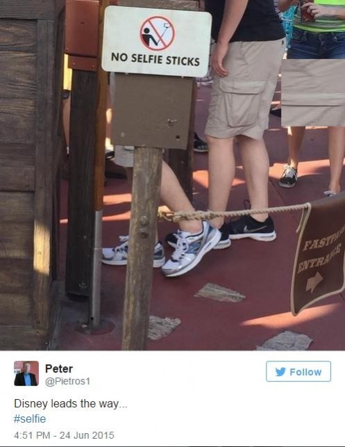 أشاع مصدر مجهول خبر حظر المسؤولون عن عالم ديزني استخدام عصا السيلفي في المكان، أي في الحدائق المتواجدة حول الشركة، بالإضافة إلى أنه سيتم مصادرة أي عصا سيلفي إذا وجدت مع أي شخص، وسيتم طرده خارجًا إذا رفض ذلك، وهذه تعتبر مشكلة لكل من سيتوجه إلى المهرجان القادم في عالم ديزني، ويُقال أنه قد تم إيقاف حافلة كانت تنقل الناس إلى عالم ديزني في كاليفورنيا، وذلك بسبب محاولة شخص لالتقاط صورة سيلفي بواسطة العصا، ولم يتم التعليق من قِبل ممثلي ديزني على هذه الإشاعات أبدًا، ولكن متحدثة باسم ديزني أكدت أن حظر عصا السيلفي سيكون ابتداءً من يوم الثلاثاء، وبذلك أصبحت شائعة حظر عصا السيلفي معلومات مؤكدة ووثوقة.