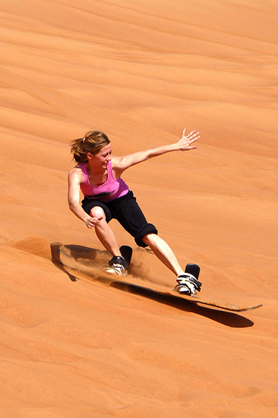 قد تكون رياضة التزحلق على الرمال اختُرِعت على ساحل ولاية كاليفورنيا، ولكن الكثبان الرملية في الصحراء العربية في دولة الإمارات العربية المتحدة أخذت هذه الرياضة إلى مستويات جديدة حيث يقبل الشباب الإماراتي و المقيمين وكذا الزوار بشكل كبير على هذه الرياضة.
