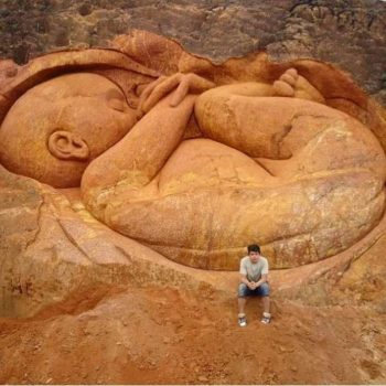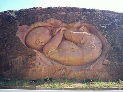 تداول مستخدمو مواقع التواصل الاجتماعي مؤخرا صورة لمنحوتة على جبل تمثل جنينا في رحم أمه، وتبع الصورة تعليقا مؤلما مفاده أن “النحات هو أب فقد زوجته وطفله الذي لم يولد في حادث لسائق مخمور.”