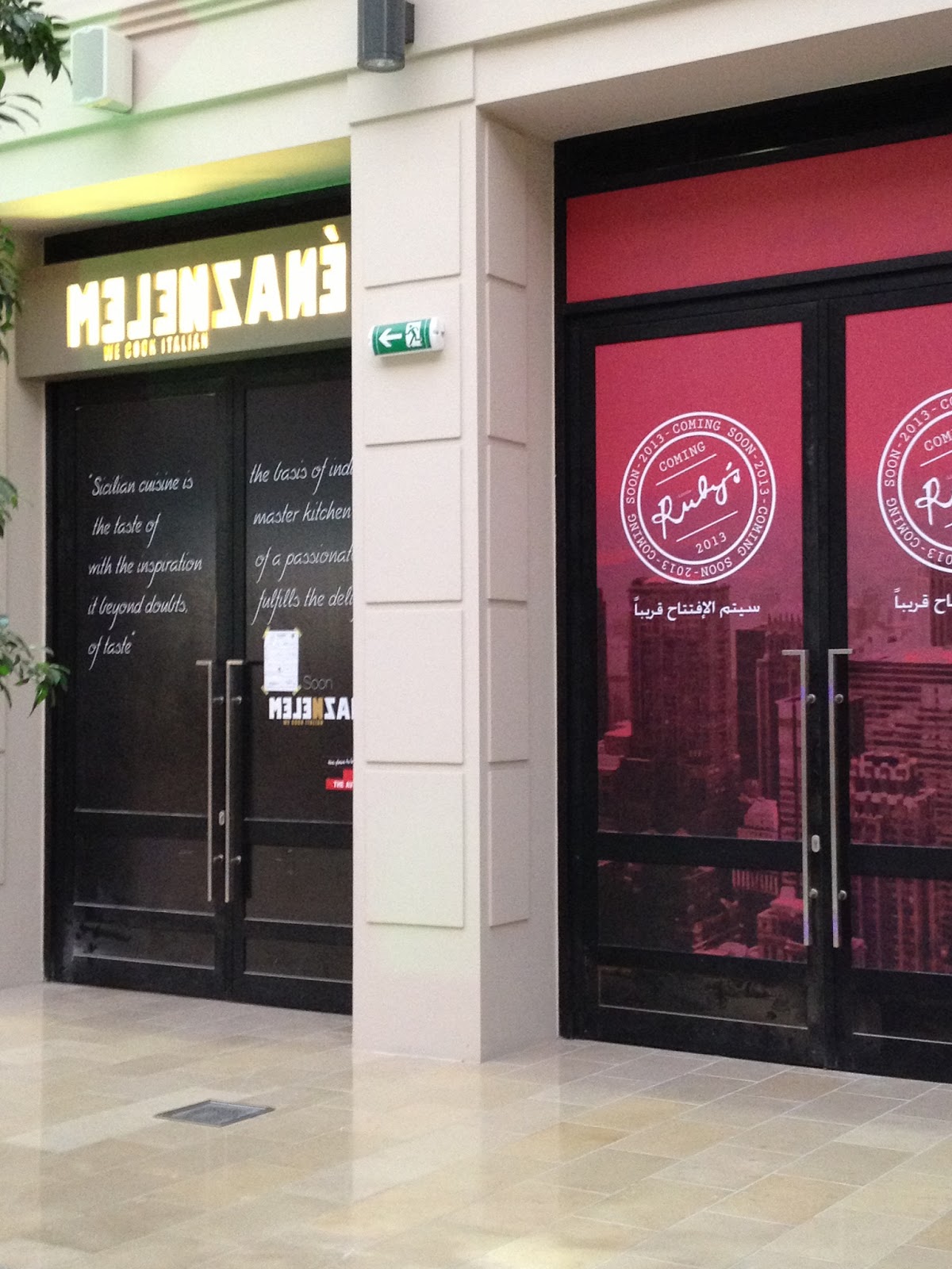 يقدم مطعم Melenzane أصناف الأطعمة من المطبخ الإيطالي من جزيرة صقلية، حيث يقدم المطعمالبيتزا الأصلية، أطباق المكرونة، الريزوتو وشطائر البانيني المشوية. وتشمل قائمة الأطباق الرئيسية أطباق كلاسيكية مثل طبق funghi vitellinee الذي يحتوي على اللحم مع المشروم، طبق الدجاج بالجبنة البارميزان pollo parmigiana وطبق الباذنجان المميز melenzane casserole.