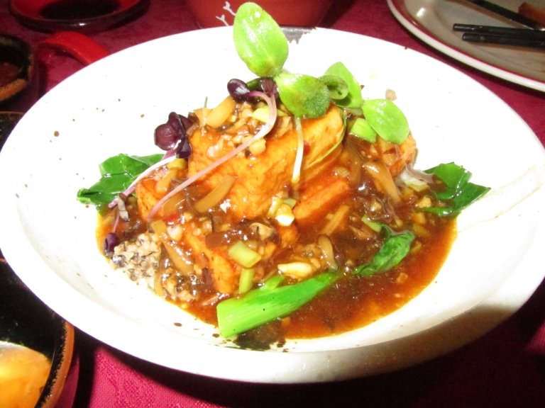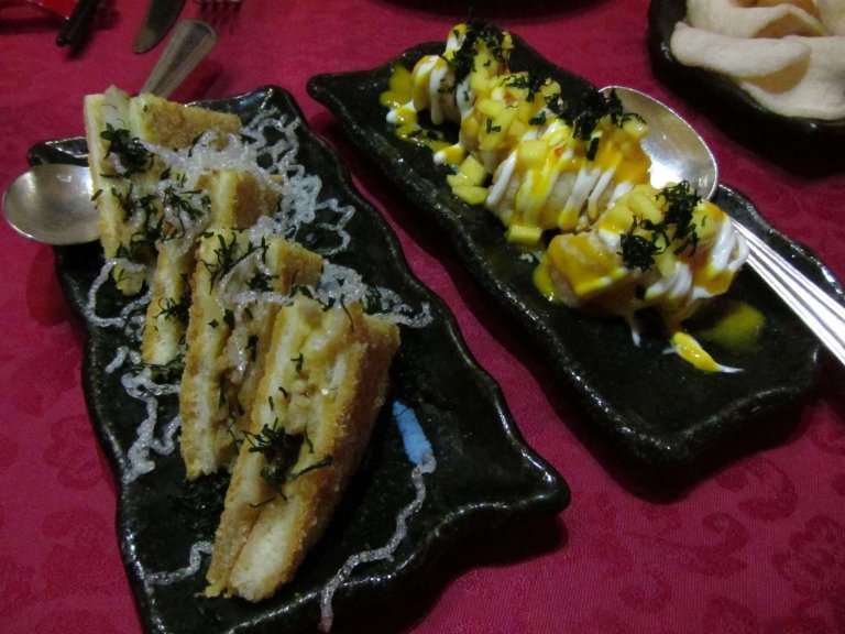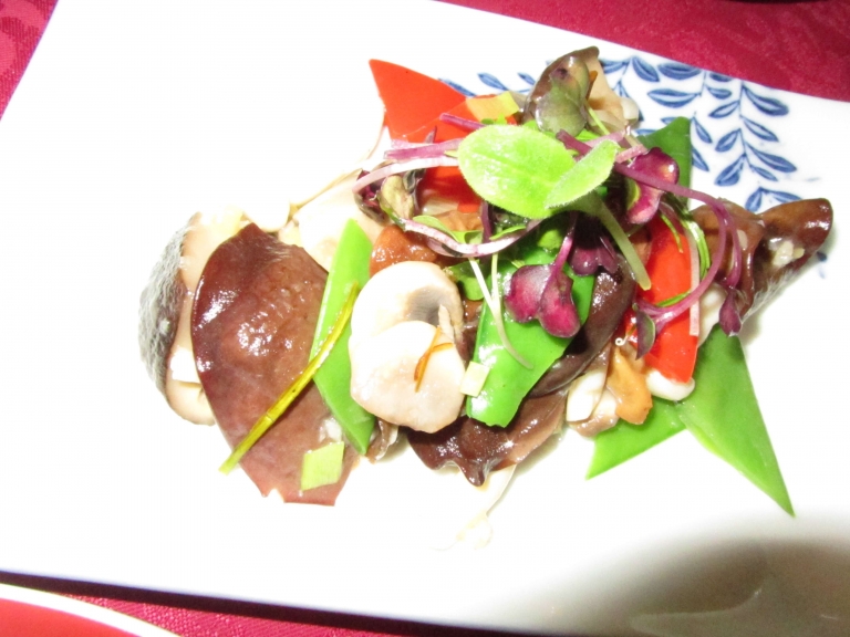 من المقبلات طبق لذيذ من الدجاج المحمر مع الجبنة وحبوب السمسم chicken toast with cheese and sesame seeds، وهي عبارة عن خبز التوست المحمر والمحشو بالدجاج والجبنة ومزين بحبوب السمسم، إضافة إلى القريدس المقرمش مع صلصة مايونيز المانجو crispy prawns with mango mayonnaise sauce، ومن وجبات النباتيين يمكنك اختيار توفو مقلي مع صلصة الكمأة السودا pan fried tofu with black truffle sauce، بالاضافة الى طبق من أنواع مختلفة من الفطر المشكل المطهو ببطأ، ولابد من إضافة لمسة صينية من خلال أصناف الــ dim sum وهي عبارة عن عجينة مطهوة على البخار محشوة الجمبري واللوبستر والسلطعون Steam dumpling with shrimp، لقد امتازت المقبلات بروعة في طريقة التقديم والطعم الذي لا يوصف من شدة لذته.