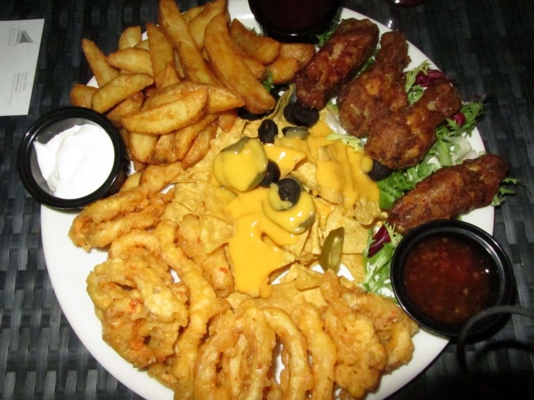 وبعد طلب شيشة العنب، بدأ مشوار الطعام، لقد طلبنا من المقبلات أحد الأطباق المخصصة للمشاركة snack platter والذي يتضمن عدة أنواع من المقبلات في طبق واحد، ومنها الكليماري الـمقرمش، وأجنحة الدجاج، والناتشوز مع توابله الخاصة، وبطاطا الودجز، ويعد هذا الطبق هو الخيار الأمثل لتبدأ به أمسيتك هناك.