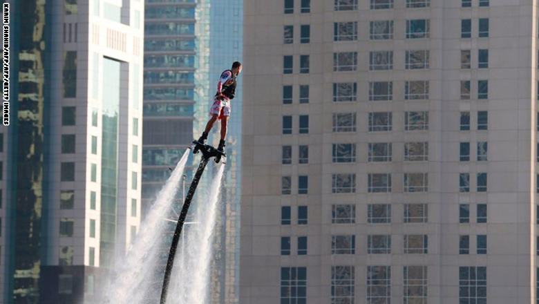 الاستمتاع بالزلاجة المائية الطائرة (Flyboard) على شواطئ دبي. وقد يفوق ارتفاع روّاد هذه اللعبة من المحترفين الـ 9 أمتار.