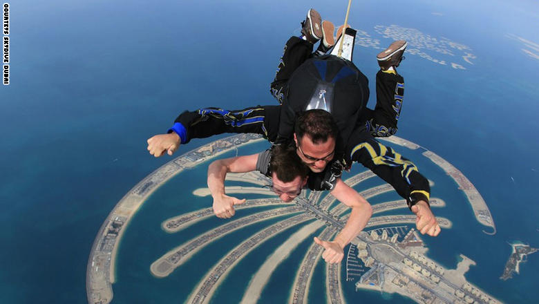 تجربة الهبوط بالمظلات في نادي “سكاي دايف دبي،” والاستماع بمشاهدة نخلة جميرا من أعلى. ويتم القفز من على ارتفاع أكثر من 3