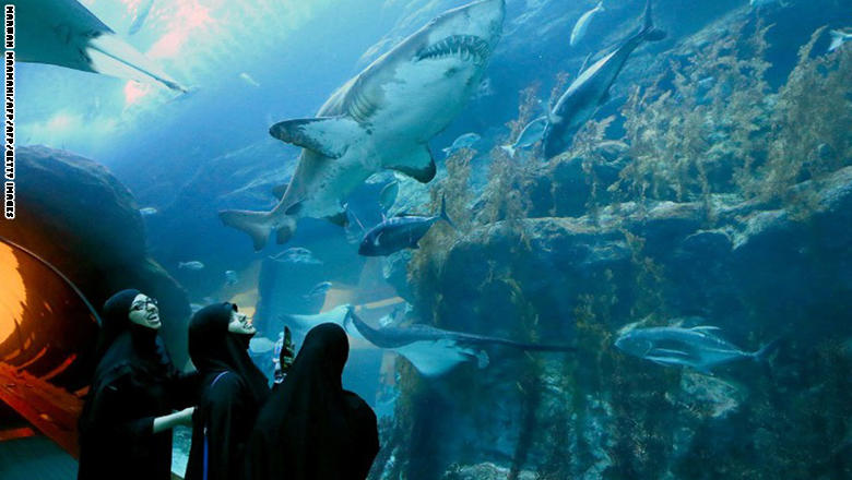 تجربة الغوص مع أسماك القرش في حوض “دبي أكواريم” وحديقة الحيوانات المائية في دبي مول.
