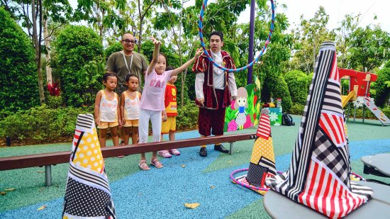 • لا تفوتوا فرصة المشي على الجسل المعلق على ارتفاع 22 متر فوق الحديقة وبطول يصل لـ 128 متر والذي يمر بين الابراج الملونة حيث يوفر لكم مشاهد بانورامية مذهلة على الحدائق الخضراء والافق حيث يمكنكم رؤية خليج مارينا