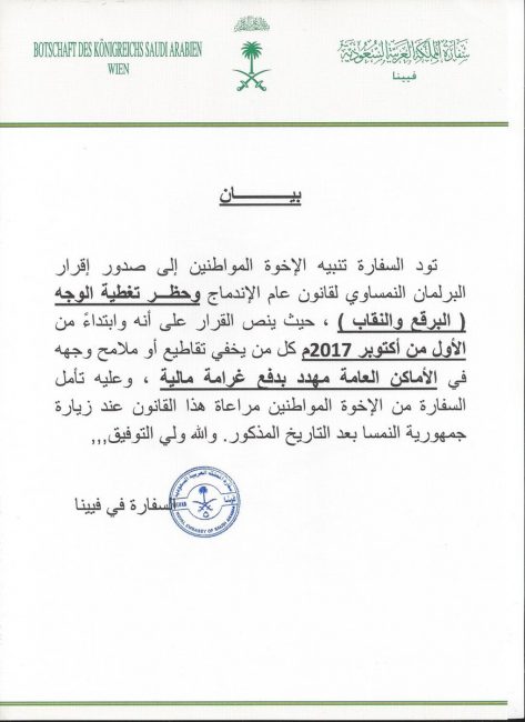 وقال نص البيان “أنه ابتداءً من الأول من أكتوبر 2017 م سيتم فرض غرامات مالية على كل من يخفي تقاطيع أو ملامح وجهه في الأماكن العامة، وعليه تأمل السفارة من الإخوة المواطنين مراعاة هذا القانون عند زيارة جمهورية النمسا بعد التاريخ المذكور”.