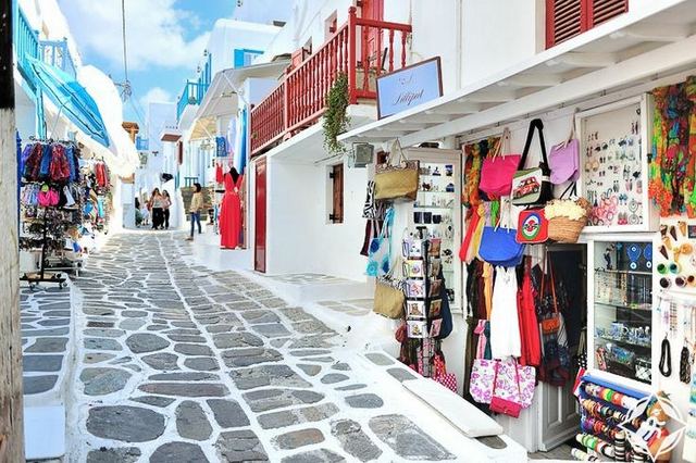 جزيرة ميكونوس اليونانية هي مكان رائع للتسوق اضافة الى كونها تذخر بالاماكن السياحية، فهي تضم اكثر من 170 محل تجارياً للازياء وحوالي 90 محلاً للمجوهرات بالاضافة الى محلات الهدايا التذكارية ومحلات السوبر ماركت وغيرها الكثير، حيث أنك ستجد في كل زاوية وشارع من شوارع الجزيرة العديد من المتاجر المميزة