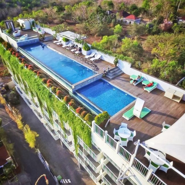 من الفنادق الجميلة جدًا يرتفع الفندق عن سطح البحر حيث الغابات يمكن الاستيقاظ صباحًا وتناول فنجان القهوة الاندونيسية وأنت تنظر على الطبيعة والغابات من حولك يمتاز الفندق بوجد حمام سباحة غير منتهي في الروف يطل الفندق على تلال بوكيت في جيماران Bukit hills of Jimbaran يستخدم الفندق ألاف الأضواء بالمساء مع قوارب الصيادين تحت سماء الليل المرصعة بالنجوم تمتاز الغرف بالأناقة والديكور الجميل الفخم ويوجد مطعم أنيق يقدم الأطعمة المختلفة الطازج والتكلفة اليومية 24 دولار.