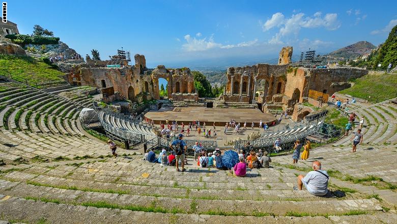 مدرج “تاورمينا” اليوناني تقع مدينة تورمينا في جزيرة صقلية، وهي إحدى أشهر وجهات الجزيرة السياحية، وتشتهر بمدرجها اليوناني، وشواطئها الرائعة، وإطلالتها على جبل “إتنا،” ومطاعمها اللذيذة.