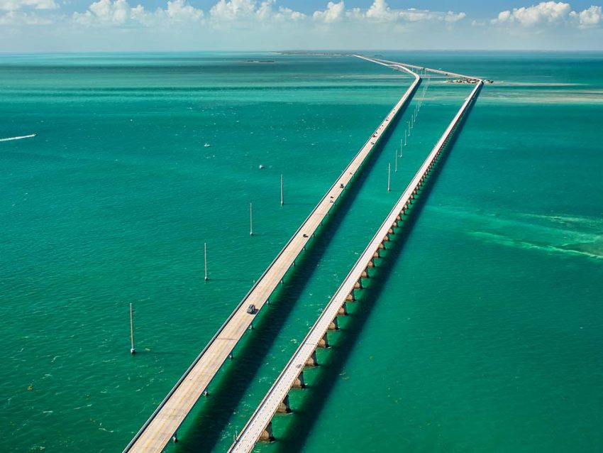 يقع جسر الأميال السبعة في ولاية فلوريدا الأمريكية ليوفّر قيادة رائعة وسط المناظر الخلابة، لكن في طقس حار وممرات ضيقة. يحيط خليج المكسيك بالطريق من جهة والمحيط الأطلسي من جهة أخرى، مما يمنح مناظر مذهلة لشروق الشمس وغروبها في نفس المكان.