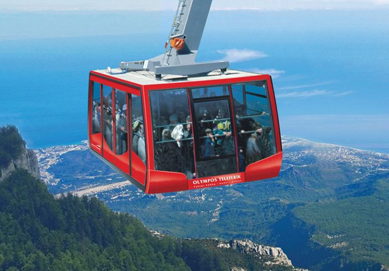 يرتفع جبل اوليمبوس مسافة ارتفاعه 2,919 مترًا ، عن مستوى سطح البحر ، تم افتتاح التلفريك عام 2007 ، حيث يبدأ التلفريك ، رحلته من سلسلة جبال طوروس في منطقة تكروفا -كيمر ، إلى قمة تهتلي والتي ترتفع 2365 عن مستوى سطح البحر ، وتستغرق الرحلة 10 دقائق ، و تتسع العربة لنقل 80 شخص ، تنخفض درجة الحرارة في الأعلى وتستمر الثلوج حتى بداية فصل الصيف ، و تحتوي محطة التلفريك على الجبل على مقهى  كبير ومطعم ومحلات لبيع الهدايا التذكارية.