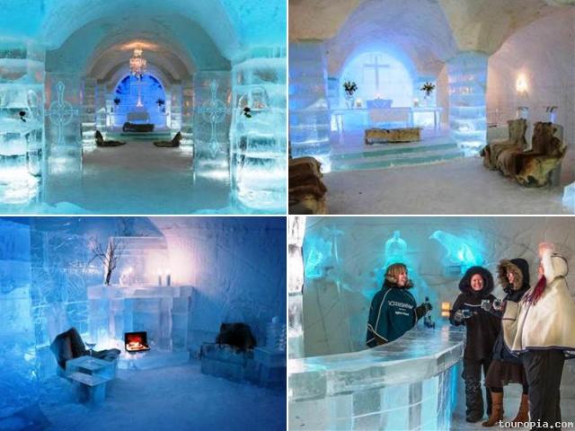 3_ قرية الثلج في كندا تقع في جزيرة سانت هيلين في كندا وتبعد حوالي 3 كيلو مترات من وسط مدينة مونتريال , وكل عام ينبني الفندق قرية مختلفة من الجليد والثلوج وتضاء المباني بالإضاءة الملونة بالليل كما يمكن للضيوف الاسترخاء في واحدة من أحواض المياه الساخنة أو الحصول على مشروب في زجاج جليدي في غرفة الثلج ويوجد كوخ في القرية مصنوع بالكامل من الجليد وإطارات من الخشب للاسرة ويوجد كيس النوم الحراري في الغرف للتدفئة في الليل .