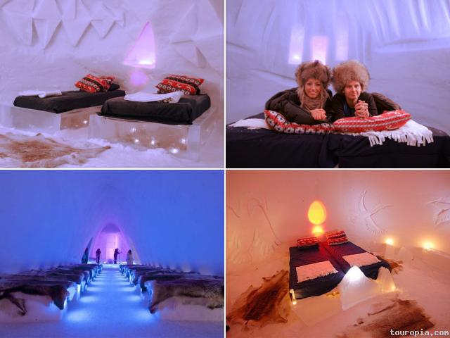 10_فندق القباني التا مصنوع كلياً من الجليد ويقدم تجربة فريدة في أقصى شمال البلاد , ويتم توفير جلد الرنة لصنع منصات للنوم وأكياس نوم فائقة التدفئة في كل غرفة ولكن مع درجة حرارة ثابتة بين -4 و -7 درجة مئوية , ويضم الفندق ساونا واحواض مياه ساخنة في الهواء الطلق .