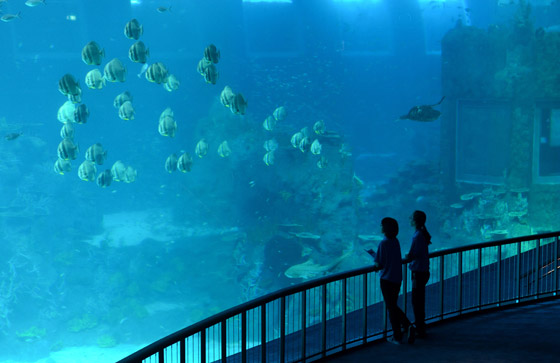2- حوض الأحياء البحرية ” الأكواريوم “، والذي يضم أكثر من مئة ألف من الأنواع المختلفة من الحيوانات المائية والكائنات البحرية المختلفة ، مثل ” دلافين” و”أسماك إنقليس” و”قناديل بحر” و”أسماك الشفنين” و”القرش” ، وغير ذالك من الكائنات البحرية التي تعيش فيما يزيد عن ستون مليون لتر مكعب من المياه، فتأخذ الزائر إلى أعماق البحار وعوالمه العجيبة، فضلاً عن نفق طوله مايقارب من 83 متراً يقدم عروضاً حية للدلافين ويمتعك بحياة بحرية في أمان تام، وتشمل أيضاً على ” ريف سويم “، الذي يُمَكِن الزائر من ممارسة الغطس مع لعبة “العالم تحت الماء” وبذالك يغوص حراً مع القرب من الأسماك الإستوائية مثل القرش، ويمكن السباحة مع الدلافين، وكذالك الغوص داخل غواصات مخصصة لذالك، علاوةً على إمكانية الإبحار لمسافات طويلة باليخوت، في المياه العميقة للعائلات والأزواج الذين يبحثون عن المغامرة والمتعة والإثارة .