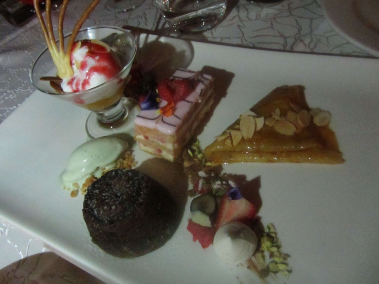ووصولا للحلويات، وهي عبارة عن طبق للمشاركة يضم ما لذ وطاب من الحلويات الفرنسية من الشوكليت فوندوم والكريب والايس كريم وكيكة الفراولة، وأكثر ما أعجبنا الشوكليت فوندوم عندما سالت الشوكلاته الذابة منها، أما عن الطعم فقد كان خيالياً.