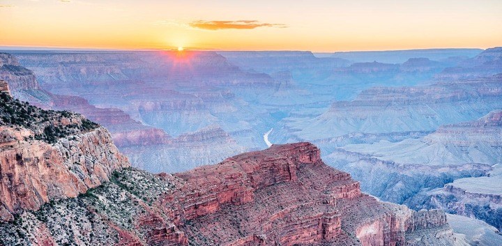 باعتبارها واحدة من عجائب الدنيا الطبيعية السبع في العالم، يوفر جراند كانيون مشاهد مثيرة طوال اليوم، ولكن غروب الشمس في هذا المكان فريد من نوعه، وخاصة عند مشاهدته من نقطة Hopi الشهيرة حيث الحجر الجيري الأحمر القديم يتحول إلى لون أكثر إشراقا بانحدار الشمس وراء جدار كانيون.