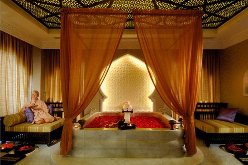 تتميز غرف قصر الإمارات بديكور استثنائي حيث تشمل ثريات من كريستال “سواروفسكي” و جدران الحرير الهندي و أوراق الذهب ذو ال24 قيراط و أحواض استحمام رومانية في أجنحة القصر التي تبلغ مساحة الواحد منها 680 مترا مربعا.