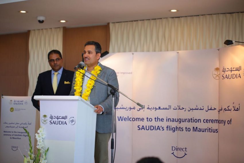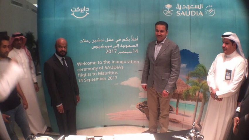 دشنت الخطوط السعودية ـ الناقل الوطني للمملكة ـ صباح اليوم الخميس 23 ذو الحجة 1438هـ الموافق 14 سبتمبر 2017م رحلاتها المباشرة والمنتظمة إلى جمهورية موريشويس وغادرت الرحلة رقم (SV481) مطار الملك خالد الدولي بالرياض الخامسة فجر اليوم وعلى متنها وفد رسمي يتقدمه مدير عام الخطوط الجوية العربية السعودية المهندس صالح بن ناصر الجاسر وسفير موريشيوس لدى المملكة محمد إقبال لاتونا وعدد من وكلاء السفر المتميزين إضافة إلى أكثر من (200) ضيفا مسافرا من المملكة والعديد من دول المنطقة ، وبعد توقف استغرق (50) دقيقة بمطار الملك عبدالعزيز الدولي بجدة وانضمام عدد من الضيوف إلى الرحلة استأنفت طائرة B787 (دريملاينر) رحلتها إلى موريشيوس ووصلت إلى مطار سير سيوساغور عند الساعة الرابعة عصرا بتوقيت موريشيوس حيث تم الترحيب بالطائرة بقوس المياه وهو التحية التقليدية في مثل هذه المناسبات .