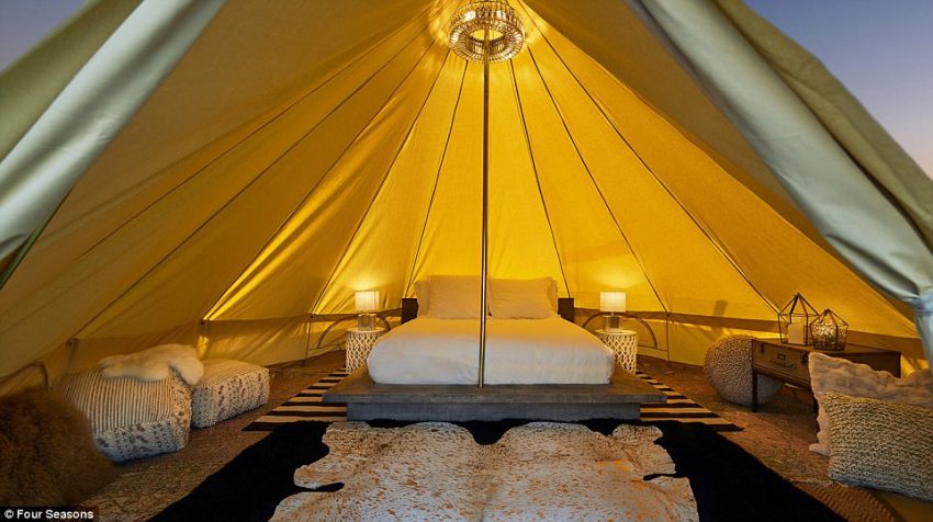 يجلب فندق بيفرلي ويلشاير الشهير في لوس أنجلوس لمسة التخييم في الهواء الطلق إلى شرفته، وهي خيمة واسعة تبلغ مساحتها 16 قدما، وارتفاعها 10 أقدام، وتتميز بسرير بحجم ملكي، وثريا بلورية، ومصابيح رخامية، وسجاد فراء، وأرائك عتيقة، بينما في الخارج على الشرفة، توجد صالة مؤثتة كبيرة تحيط بالموقد.