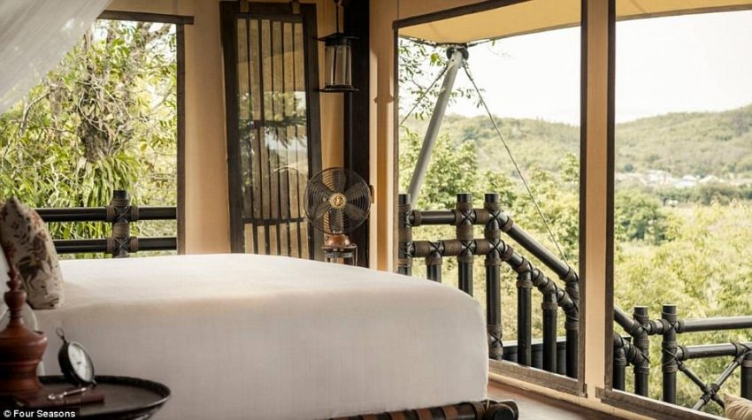 يقع فندق فور سيزونز تنتيد كامب غولدن تريانجل في منطقة غولدن تريانجل التاريخية بين تايلاند وبورما ولاوس، ويوفر تجربة تخييم فاخرة في قلب الغابة، وتأتي خيمته الفاخرة والمفروشة كاملة مع أسرة بحجم ملكي ووسائد منخفضة وخدمة الواي فاي عالية السرعة، وهناك أيضا حمام مفتوح مخطط في منطقة المعيشة، وتحتوي بعض الغرف على أحواض استحمام ساخنة كبيرة، كما يوجد مطعم في الموقع.