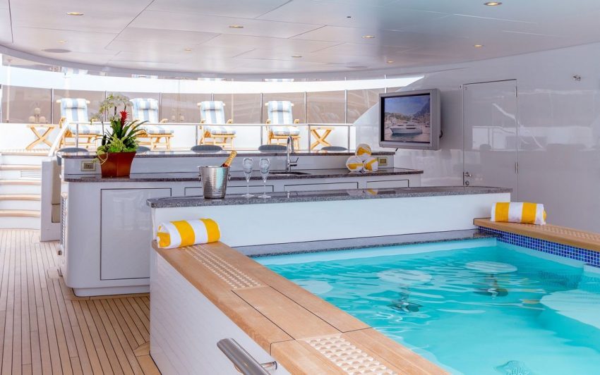 ولاستكمال المناطق الخارجية الأنيقة تم تجهيز السفينة بشرفة شمسية مذهلة، مزودة بدش في الهواء الطلق، وجاكوزي كبير.