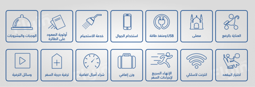 تذاكر الطيران اليوم لم تعد كما عهدناها من قبل ، فلا يعني بالضرورة قيامك بحجز تذكرة طيران حصولك على جميع الخدمات المتاحة على متن الطائرة أو كما يطلق عليها باللغة الإنجليزية In-flight services ، فاليوم نجد أن شركات الطيران تتنافس فيما بينها على تقديم خدمات إضافية على متن طائراتها بل أن هذه الخدمات الإضافية تختلف بين طائرات الشركة الواحدة، والصورة التالية توضح أهم أنواع الخدمات التى يتم تقديمها على متن الطائرة :