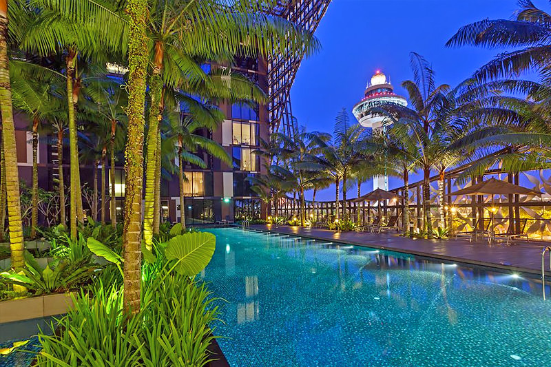 انضمت هذه البقعة الساحلية إلى قائمة أفضل المسابح في الفنادق للعديد من الأسباب، ويعتبر التصميم أهم هذه الأسباب الذي يجعلك تشعر وكأنك في حديقة غناء مورقة وأمامك البحر وذلك من خلال شرفات الغرف التي تمتد من الأرض إلى السقف. ويعتبر المسبح في هذا الفندق مكان مثالي لتناول المشروبات ومشاهدة غروب الشمس في جزيرة سنتوسا، حيث يتم إضاءة المسبح في الليل.