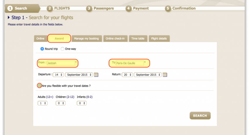 أولاً،تأكد من أن يكون التاب خاص بـ Award ومن ثم قم باختيار أي رحلة دولية، رحلتنا اليوم من جدة إلى باريس ذهاباً و اياباً:
