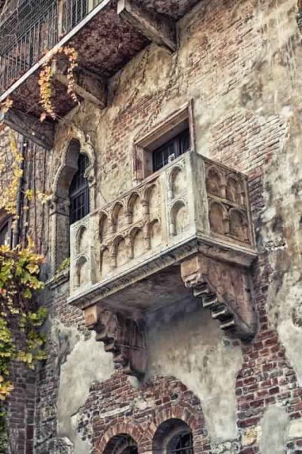 | بيت جولييت: يعود تاريخ المبنى إلى القرن الثالث عشر، وتحت شعار “كابوليت” على الواجهة الخارجيَّة، تنفتح بوَّابته على مساحة مُغطَّاة، حيث يترك العشَّاق من جميع أنحاء العالم رسائلهم. في الماضي، كان الزائرون يكتبون على الجدران، ما حدا بإدارة الموقع إلى تغطيتها بلوحات تستضيف اليوم الكتابات والبطاقات. ومن هناك، يصل الزائرون إلى المحكمة الداخليَّة، التي يتوسَّطها تمثال لجولييت مشغول بالبرونز. وفي المحكمة شرفة شهيرة، تقبع غرفة نوم جولييت المؤثَّثة خلفها. وقد أضيفت الغرفة للموقع، خلال مشروع ترميم تمَّ في ثلاثينيات القرن العشرين. في الواقع، عرف المبنى القديم استخدامات مختلفة على مرِّ القرون. أمَّا في الوقت الحاضر، فهو متحف.
