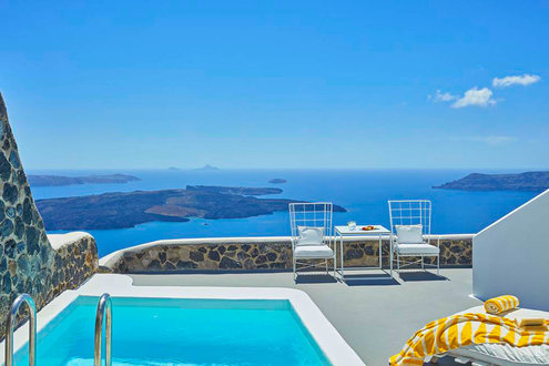 يقع هذا الفندق على بعد حوالي 10 دقائق من الشاطئ سيرًا بالأقدام، وتتميز جميع غرفه بأنها مطلية باللون الأبيض، وتحتوي على تراس خاص يطل على البحر، ويقدم خدمات الواي فاي المجانية، كما أنه يمتلك المسابح الرائعة، ويقوم الفندق بتقديم خدمات النقل من وإلى الشاطئ للزوار مجانًا، كما أنه يقوم بتقديم وجبة الإفطار في الغرف أو في الشرفة التي تلحق بالغرفة للزوار، ومن الجدير بالذكر أن وجبة الإفطار تحتوى على النبيذ والذي يعتبر مشروب الترحاب  من الفندق لزواره، ويعد هذا الفندق واحد من افضل فنادق سانتوريني.