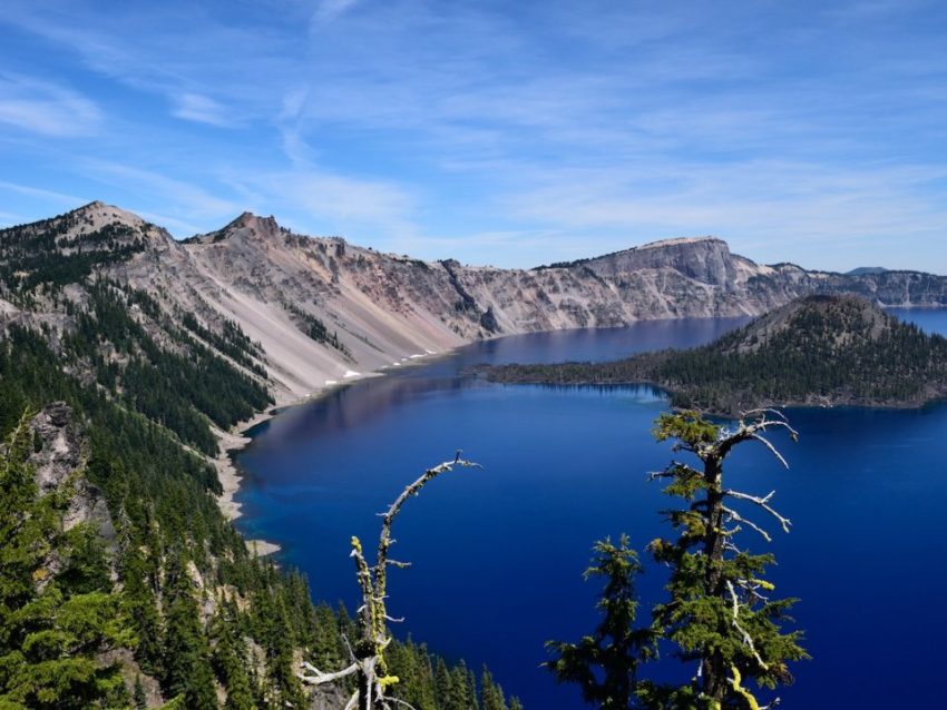المياه الزرقاء العميقة التي تملأ جبل مازاما الغارق تساعد على جعل بحيرة كريتر – التي تقع في جنوب ولاية أوريغون – واحدة من أجمل البحيرات في الولايات المتحدة الأمريكية، تلك المياه الزرقاء العميقة تكاد تكون واضحة وضوح الشمس بفضل عدم وجود تيارات أو أنهار قادمة لتعكر المياه.
