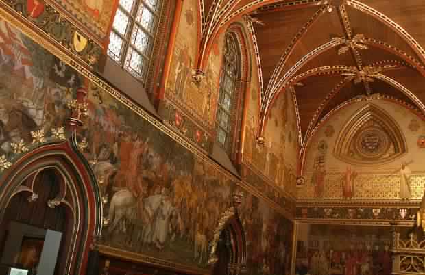 • ما ستشاهده داخل قاعة المدينة لا يقل روعة عن خارجه، فمن الداخل تحوي قاعة المدينة عدد من الغرف وفناء أيضاً جميع حوائطهم مُزينة بالكامل برسومات ونقوش رائعة الجمال وتعود إلى عصور قديمة مختلفة حيث كانت القاعة مقراً للحكم في أزمان سالفة وتم ترميمها وزخرفتها على مدار التاريخ.