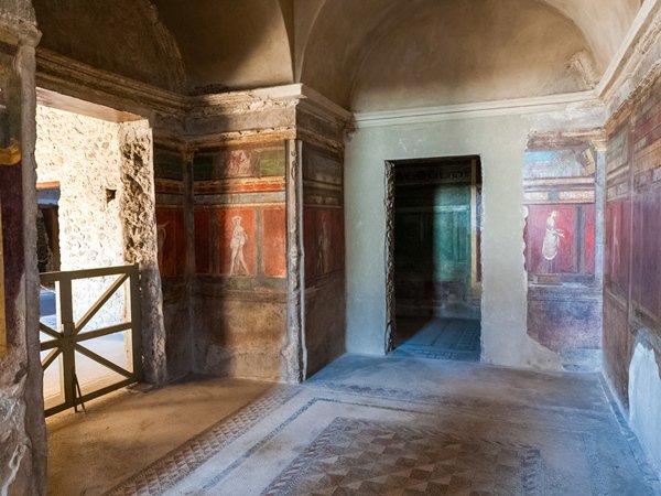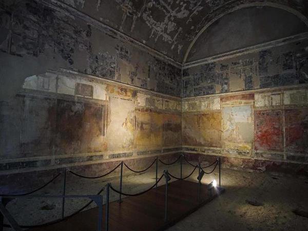 | فيللا “ميستيريز”: خارج منطقة التنقيب الرئيسة، ترتفع فيللا ” ميستيريز”، التي بُنيت في القرن الثاني قبل الميلاد، وهي تحوي أفضل اللوحات الجدارية القديمة، والتي تمَّ الحفاظ على ألوانها.