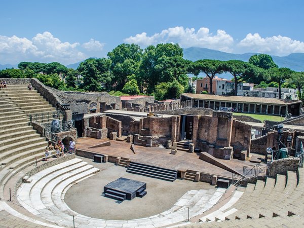 | المسارح: بُني  المسرح الكبير (تياترو جراندي) في الأرض المنحدرة، وهو يستوعب 5.000 مُتفرِّج. الصفُّ العلويُّ من المقاعد يُشرف على المدينة وجبل “فيزوف”. مسرح “بيكولو” المجاور تمَّ الحفاظ عليه بشكل أفضل، وهو المثال الأقدم لمسرح رومانيّ مسقوف، ويعود تاريخه إلى حوالي سنة 75 قبل الميلاد. إلى الجهة الشرقيَّة، يبدو مسرح صغير هو “تمبيو دي جيوف ميليتشيو” و”تمبيو دي إيزيس”. ولا يزال بإمكان  السائحين رؤية نقش على الجدران من قبل الروائي الفرنسي ستاندال في سنة 1817.