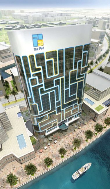 المبنى يدعى ذا باد the pad ويتم بناؤه حاليا في منطقة الخليج التجاري في وسط دبي، التي تشتهر بناطحات السحاب التي حطمت الأرقام القياسية، والفنادق الفخمة.