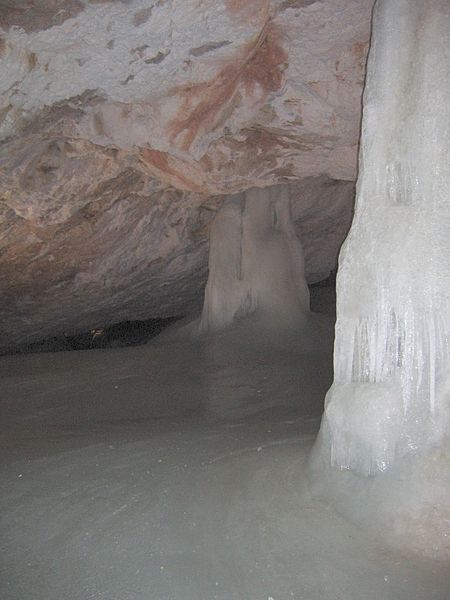 سماكة الجليد في الطابق تقترب إلى 25 مترا ( 82 قدم) ، مع مساحة من 11.200 م 2 ( 121،000 قدم مربعة) و يقدر حجم 145،000 م 3 ( 5،100،000 قدم مكعب) من الجليد ، والرطوبة النسبية بين 96 و 99 ٪.