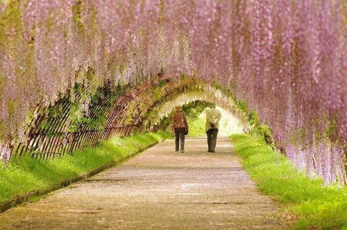 نفق ملوّن يأسر القلوب يقع في حدائق كواتشي فوجي في “كيكتاكيوشو” في اليابان. الآلاف من السياح يتدفّقون يوميًّا عليه لمشاهدة أنواع كرمة الوستاريه الـ22. والوستاريه هي كرمة في عائلة البازيلاء وتحظى بشعبية كبيرة في الحدائق الشرقية والغربية.