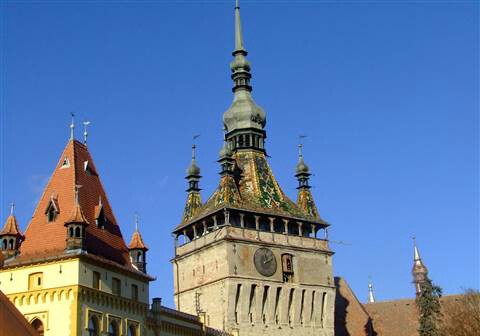 برج الساعة من أبرز الأماكن السياحية في سيغيسوارا يبرز ضمن سماء المدينة، من خلال سقفه المزين بعدة ألوان تشبه قسور التنين.