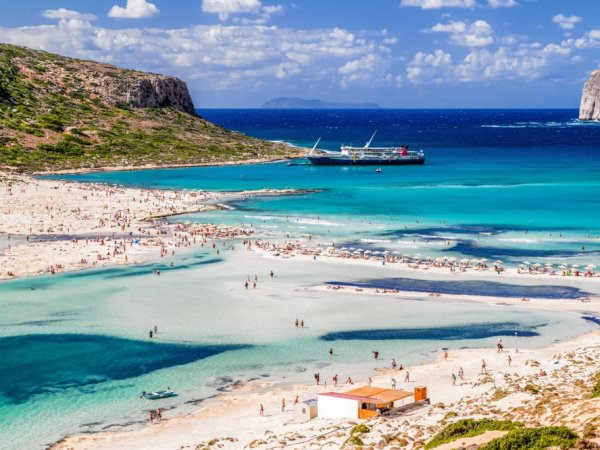 “بالوس”، من شواطئ “كريت” الأكثر روعة. ولبلوغه، يجب ركوب أحد زوارق الرحلات، التي تنطلق من “كيساموس” (40 كيلومترًا غربي خانيا)، كما من الممتع للغاية استئجار سيَّارة رباعيَّة الدفع لهذه الغاية. وبعد ركن السيارة، على السائحين السير في ممرٍّ خاص بالمشاة لعشرين دقيقة، بغية الوصول إلى شاطئ “بالوس” الرملي الأبيض الساحر، والذي يمتدُّ إلى بحيرة خلَّابة بلوني الفيروزي والزمرد. من هناك، يمكن المرور إلى جزيرة “جرامفوسا” الصغيرة، حيث حصن فينيسي من القرن السادس عشر. الجدير بالذكر أن الأمير تشارلز والأميرة ديانا مارسا السباحة هناك، خلال شهر العسل في سنة 1981.
