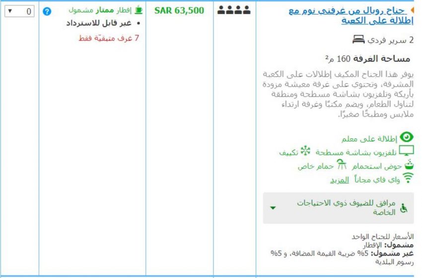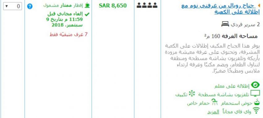 سعر الجناح 3,250 ريال، يشمل منطقة معيشة واسعة ومنفصلة وحمام ويوفر إطلالات على الكعبة المشرفة.