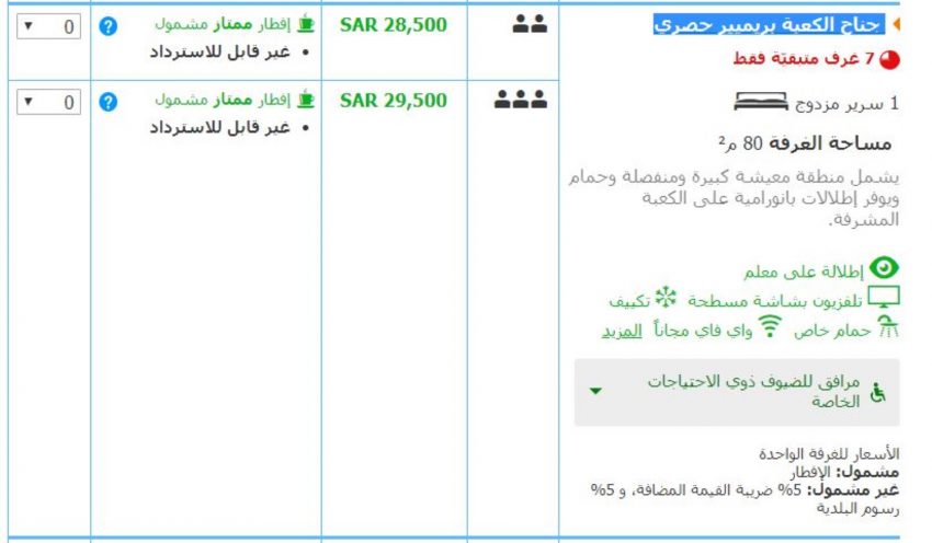 سعر الجناح 18,500ريال ،يشمل منطقة معيشة واسعة ومنفصلة وحمام ويوفر إطلالات على الكعبة المشرفة.
