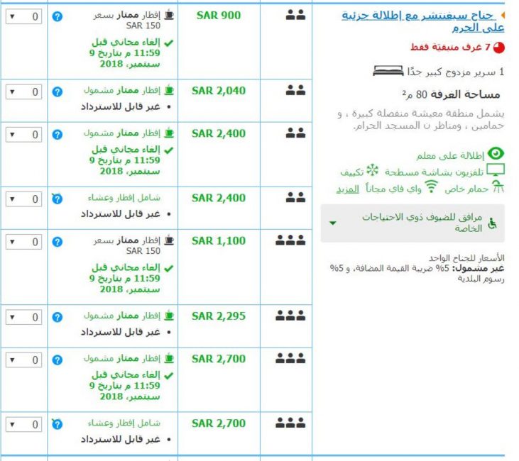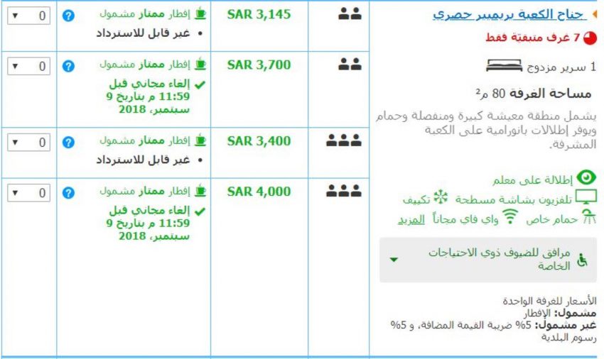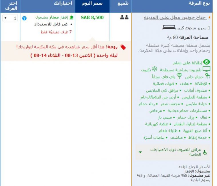 وفقا لتجربها أجرينها عبر موقع بوكينج يبلغ سعر الليله الواحدة (الاثنين 13-08 – الثلاثاء 14-08 ) خلال موسم الحج على النحو التالي :