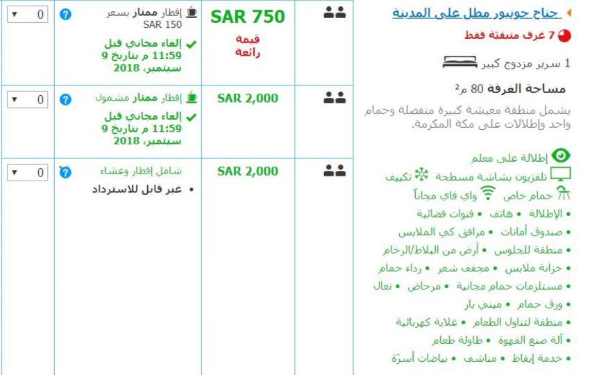وعلي صعيد آخر تم تجربة تغير موعد الحجز لما بعد الحج في نفس التواريخ ولكن الشهر المقبل وكانت النتيجة كما يلي ليلة واحدة ( الخميس 13-09 – الجمعة 14-09 ):