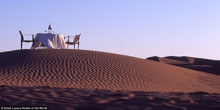 يقدم فندق “دار أحلام” بالمغرب وجبة الغداء في بستان اللوز المليء بالزهور، في مخيم دار الأحلام الصحراوي الفاخر وعشاء حميمي على الشموع في الصحراء، بحيث يمكن للضيوف مشاهدة المناظر الطبيعية الجميلة ومظلة كبيرة من النجوم تحيطهم.